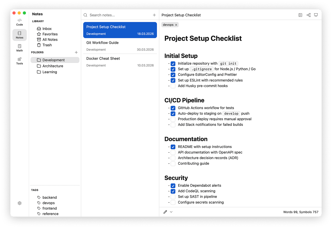 Use Notes when you want to keep markdown documents close to your snippets and daily workflow.
