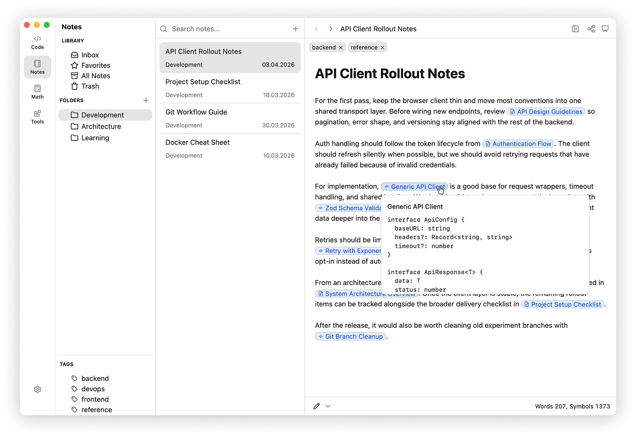 - Keep long-form docs in Notes while linking reusable code examples from Code